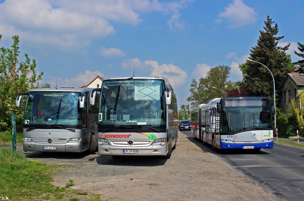 Ein Solaris Urbino G der HVG fährt an zwei Mercedes-Reisebussen vorbei. Aufgenommen am Bahnbübergang in Werder (Havel). 25.04.2014
