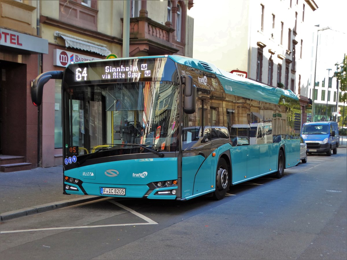 VGF/ICB Solaris Urbino 12 Wagen 205 am 14.10.17 in Frankfurt am Main Basler Platz auf der Linie 64