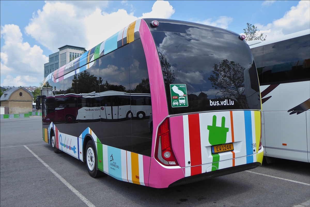 EW 1244, Heckansicht des Elektrobuses der Marke Sileo, gesehen auf einem Parkplatz in der Stadt Luxemburg am 29.05.2019.