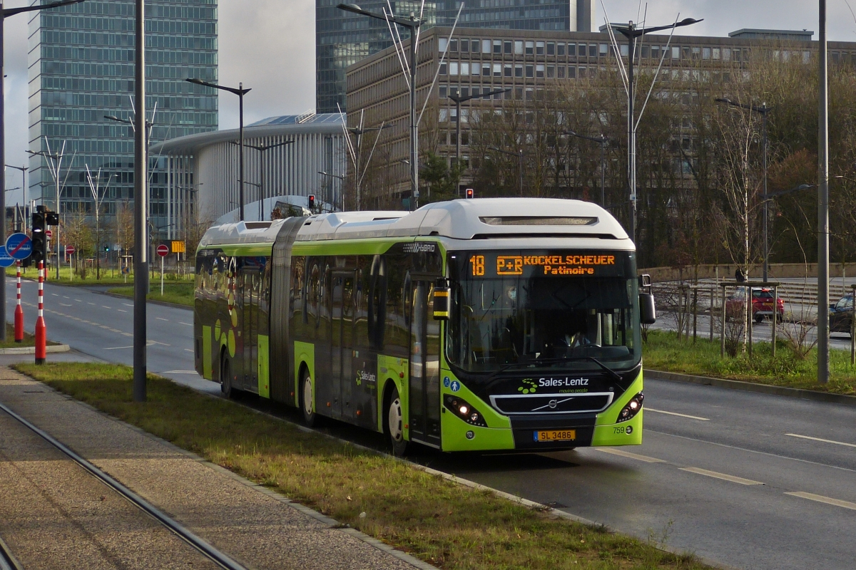 SL 3486, Volvo Hybrid Bus von Sales Lentz, bedient am 06.01.2022 die Linie 18 durch die Stadt Luxemburg zwischen zwei Auffangparkplätzen am Rande der Stadt.