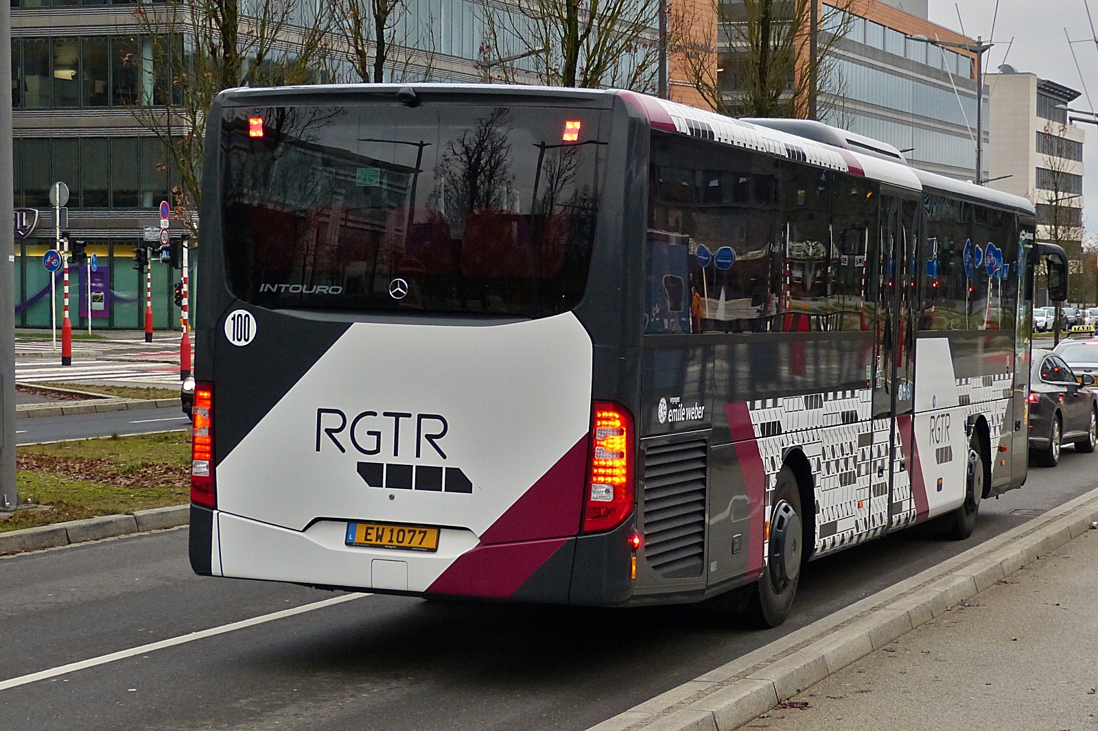 EW 1077 Heckansicht des Mercedes Benz Intouro von Emile, gesehen in den Straßen der Stadt Luxemburg. Am Seitenteil am Heck des Busses in der neuen Farbgebung, sieht man das Logo des Busbetriebes. 01.2023