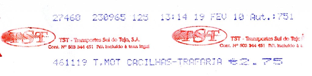 ALMADA (Distrito de Setúbal), 19.02.2010, Busticket für eine Einzelfahrt von Cacilhas nach Trafaria (Buslinie 125 der Gesellschaft TST)