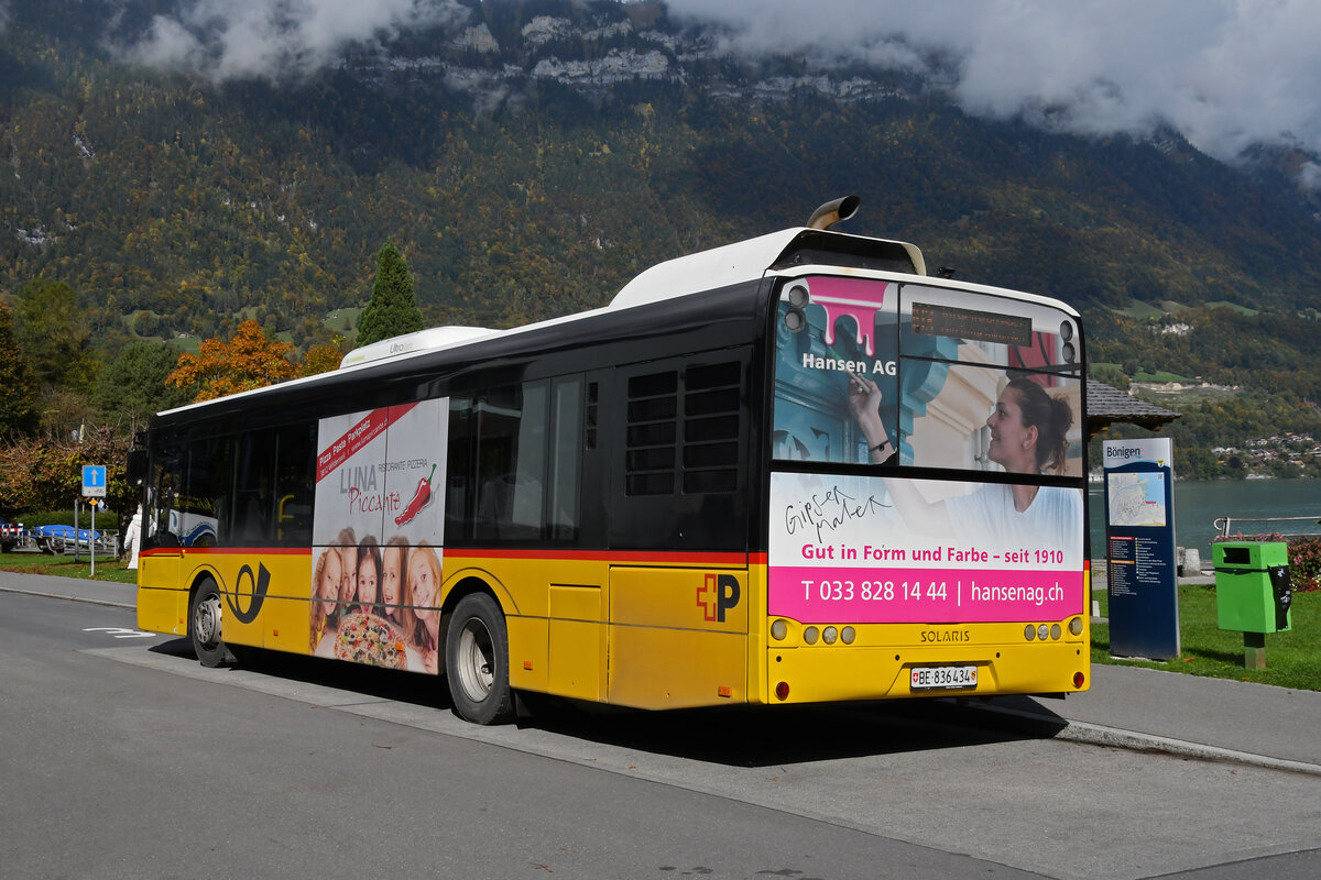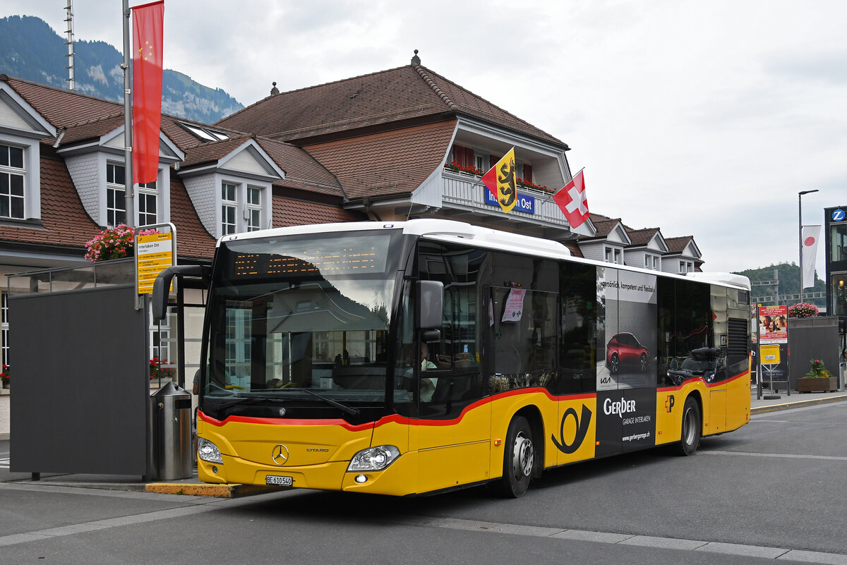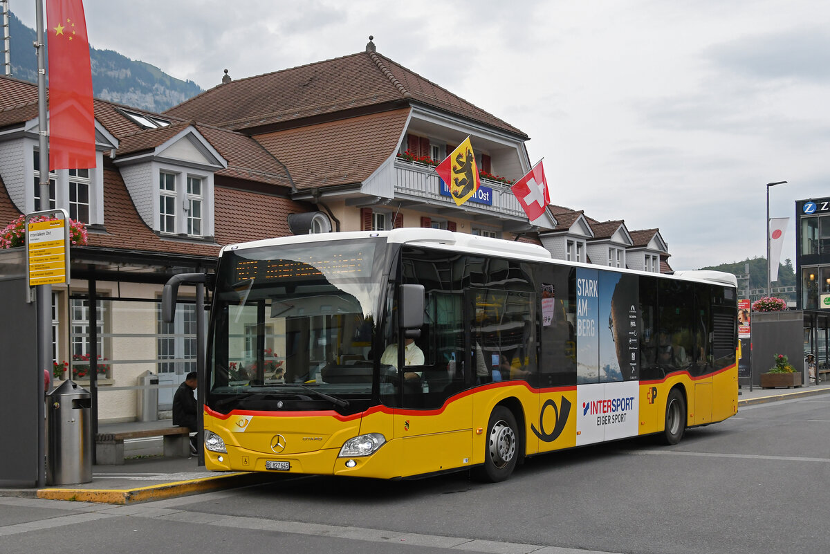 Postauto - Mercedes e Citaro BE 610536 bei den Haltestellen vor dem Bahnhof Interlaken Ost am 22.11.2025