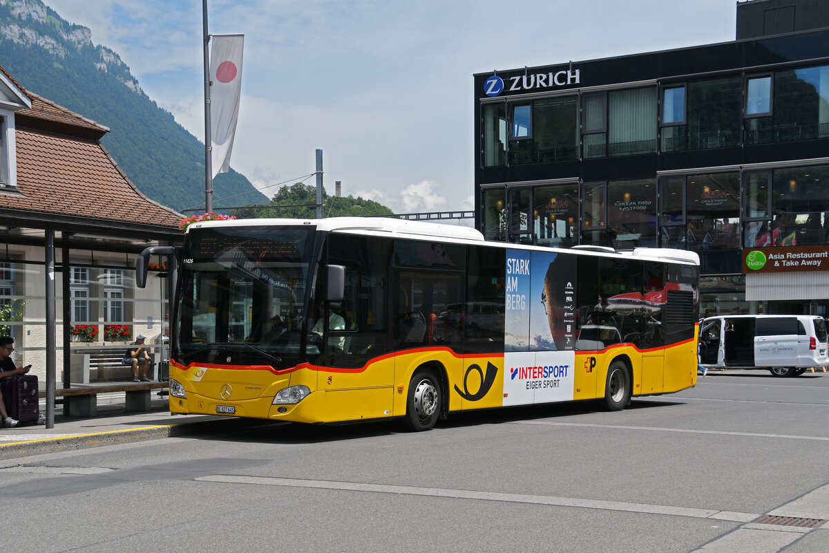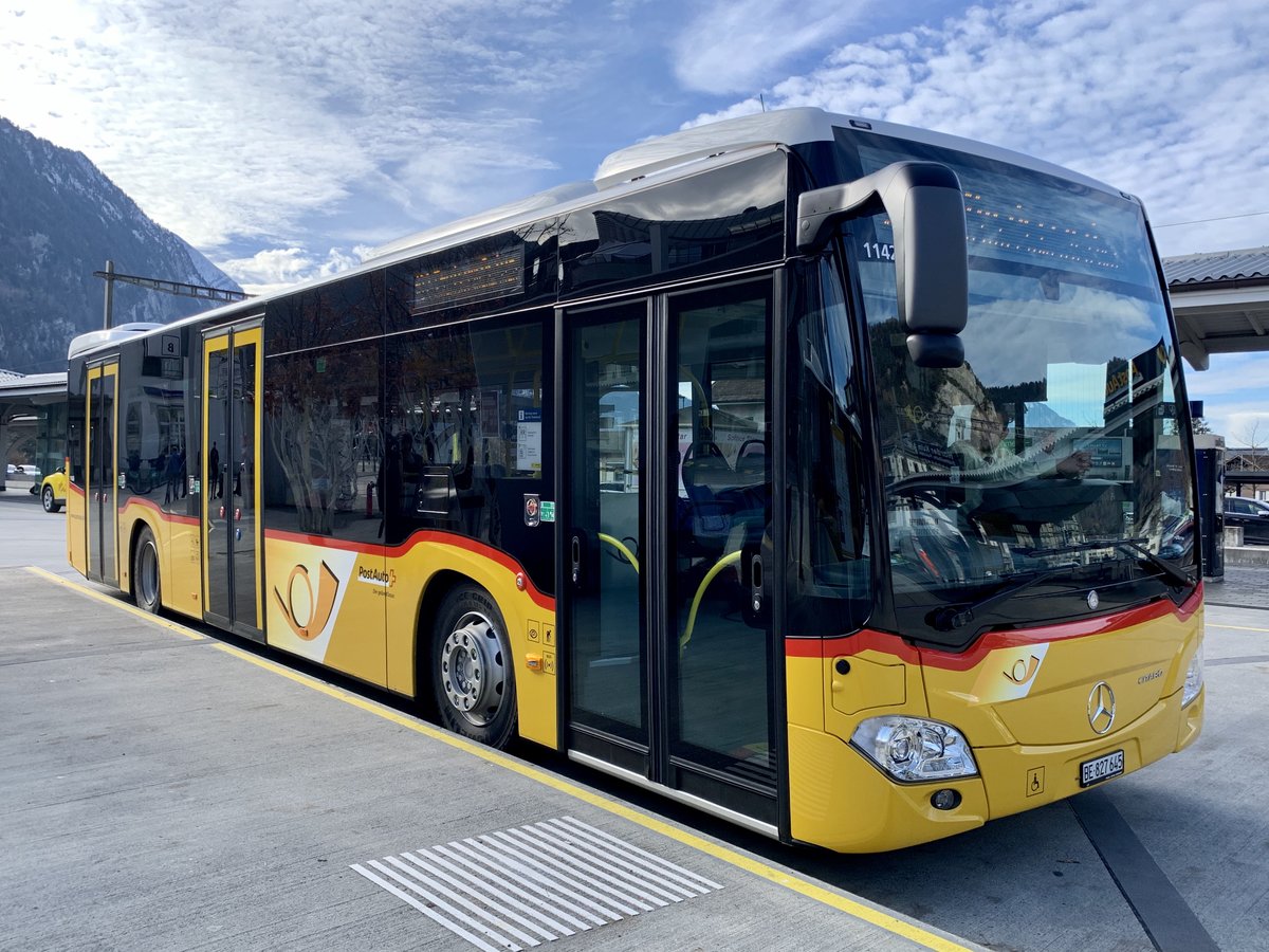 Der neue MB C2 hybrid '11426'  BE 827 645  von PostAuto Regie Interlaken, am 23.11.20 auf dem Bahnhofplatz Interlaken West.