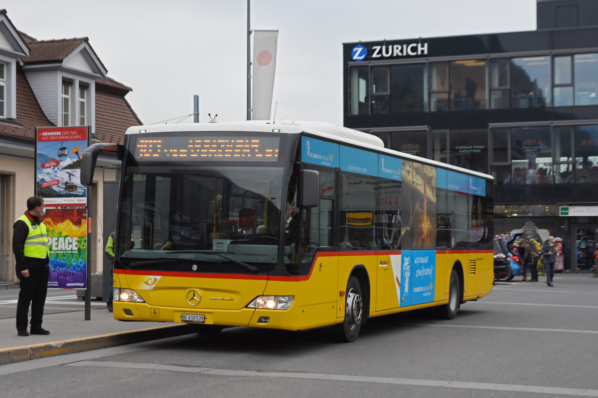 Mercedes Citaro der Post, auf der Linie 103, steht an der Endstation beim Bahnhof Interlaken Ost. Die Aufnahme stammt vom 30.11.2020.