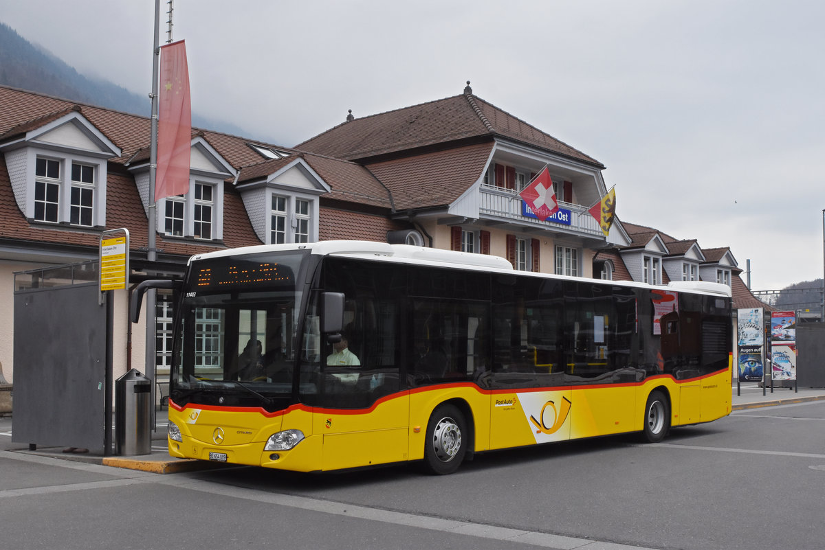 Mercedes Citaro der Post, auf der Linie 60, wartet an der Endstation beim Bahnhof Interlaken Ost. Die Aufnahme stammt vom 03.04.2021.