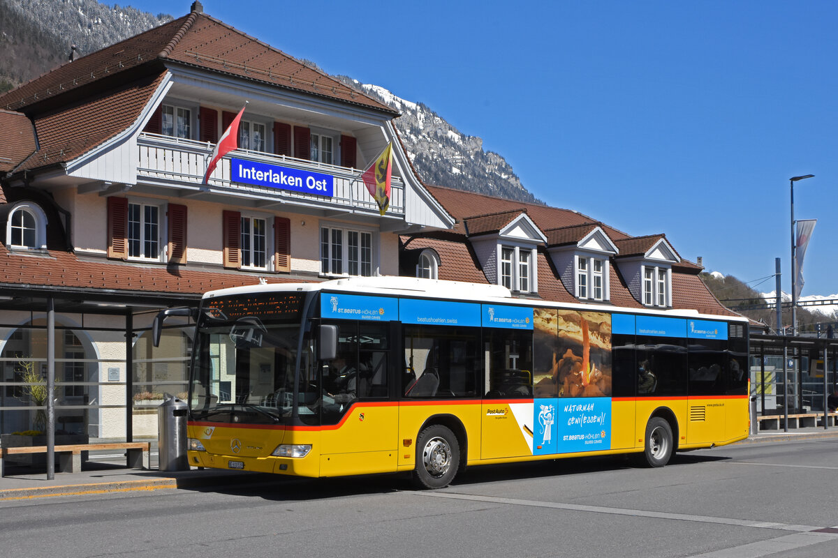 Mercedes Citaro der Post, auf der Linie 102, wartet an der Endstation beim Bahnhof Interlaken Ost. Die Aufnahme stammt vom 08.04.2021.