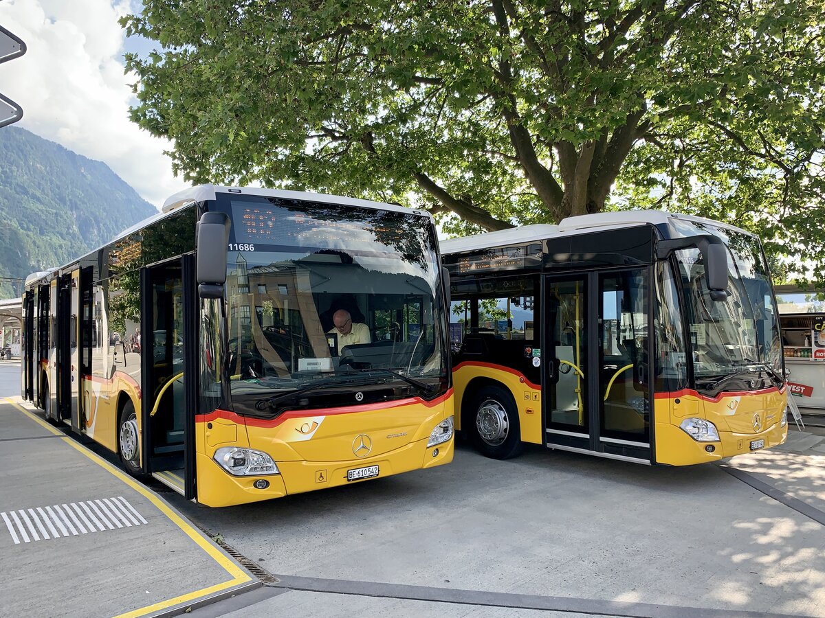 Die neuen MB C2 hybrid '11686' und rechts '11685' am 10.7.21 beim Bahnhof Interlaken West.