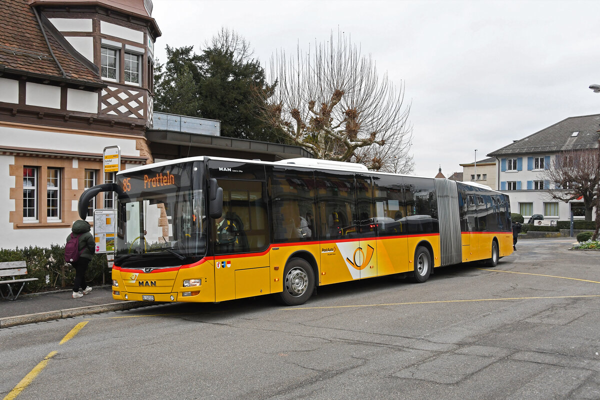 MAN Lions City der Post, auf der Linie 85, wartet am 24.01.2023 an der Haltestelle beim Bahnhof Rheinfelden.