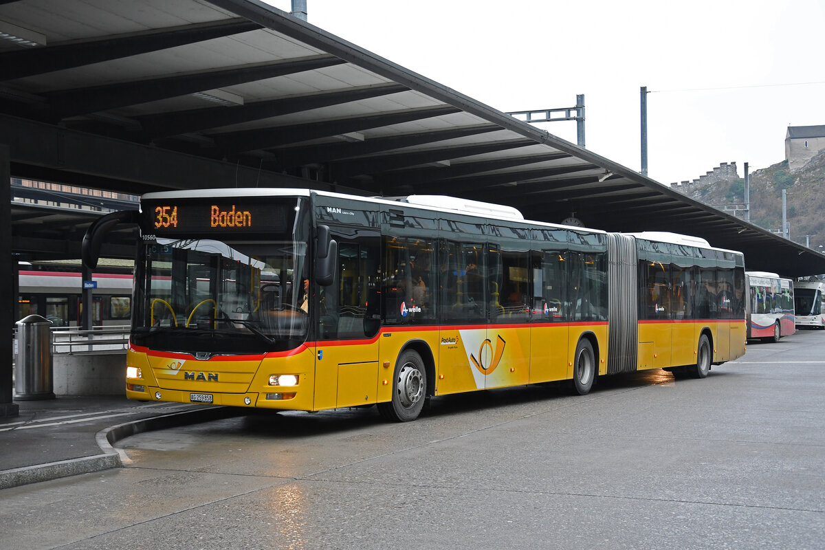 MAN Lions City der Post, auf der Linie 354, wartet am 25.01.2023 an der Haltestelle beim Bahnhof Baden.