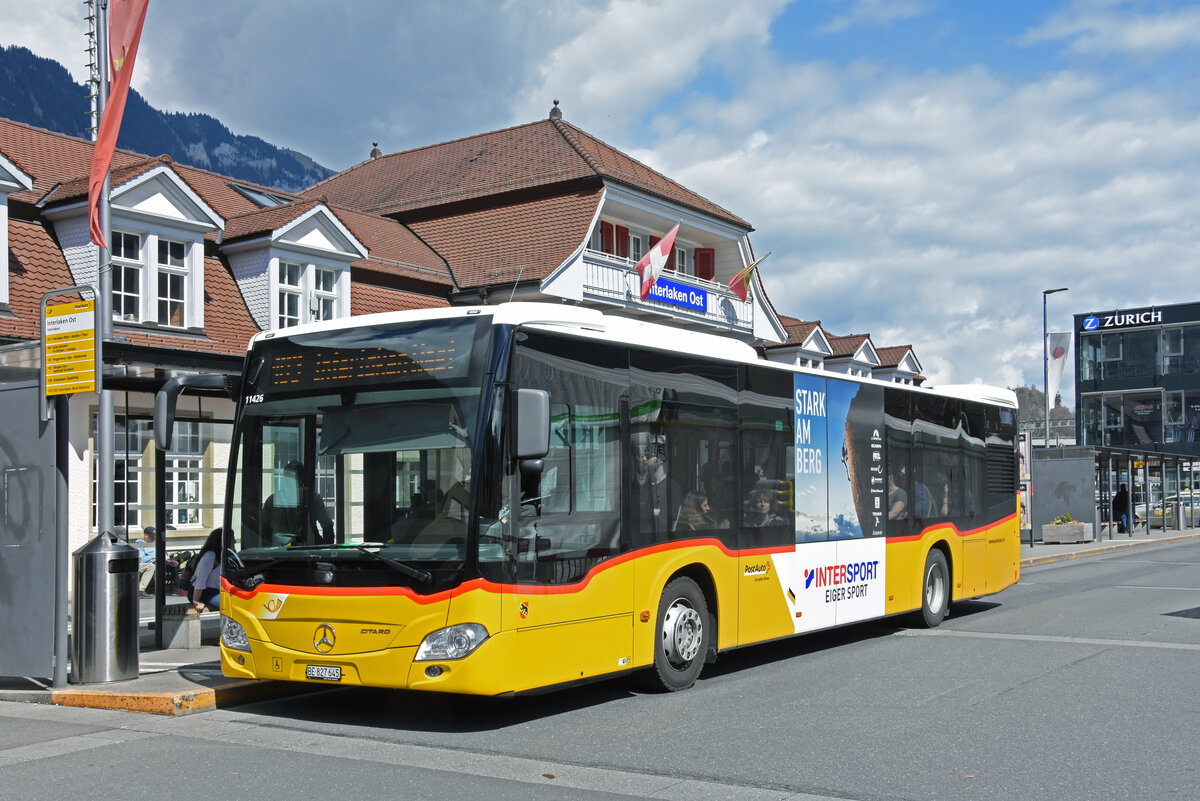 Mercedes Citaro der Post, auf der Linie 103, wartet am 08.04.2023 an der Haltestelle beim Bahnhof Interlaken Ost.