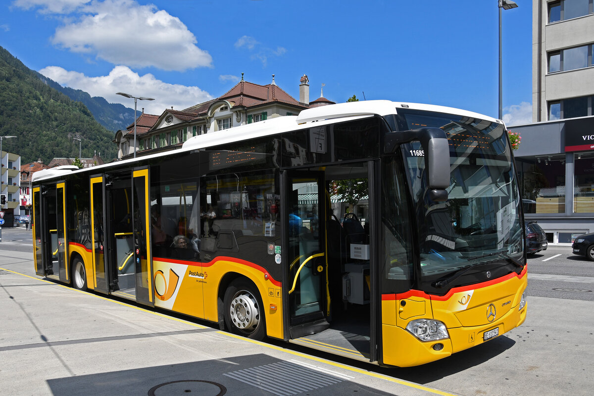 Mercedes Citaro der Post, auf der Linie 105, wartet am 03.07.2023 an der Haltestelle beim Bahnhof Interlaken West.
