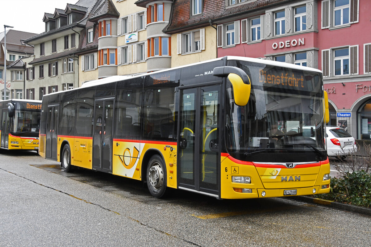 MAN Lions City 6 der Post, wartet am 12.02.2024 als Dienstfahrt beim Bahnhof Brugg.