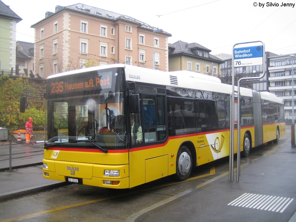 Postauto/PU Stutz Nr. 174 (MAN A23 NG363Ü) am 1.12.09 beim Bhf. Zürich Wiedikon. Der Wagen 174 ist der einzige NG363 von PU Stutz, der in der Garage Aeugstertal stationiert ist. Er trägt daher als einziger seiner Gattung ein ZH-Kennzeichen. Die Schwesterfahrzeuge aus der Garage Jonen wurden im Kt. Aargau eingelöst.