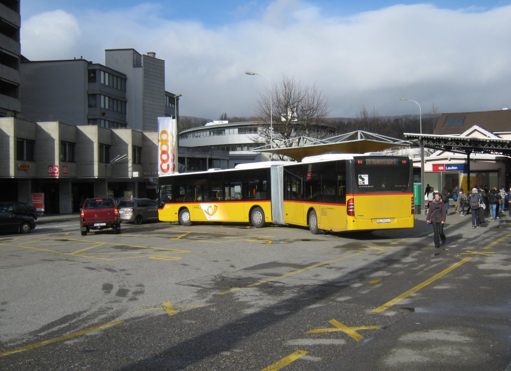 Die ersten Gelenkbusse von Postauto Laufen. Seit letztem Dezember umfasst der Fuhrpark von Postauto Laufen nun auch über Gelenkbusse. Im Bild ein Citaro II G beim Bahnhof Laufen, 04.01.2011.