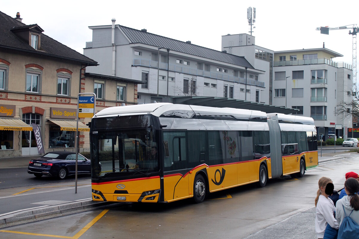 Postauto/Pu Stutz Nr. 449/PAG-ID: 12326/ZH 402 126 (Solaris New Urbino 18 electric) am 22.10.2025 beim Bhf. Affoltern am Albis