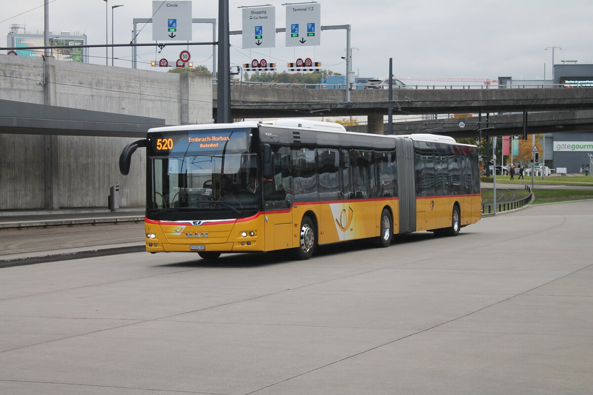 Postauto/Regie Zürcher Unterland Nr. 388/PAG-ID: 11272/ZH 874 765 (MAN A23 Lion's City G) am 14.10.2025 beim Flughafen Zürich