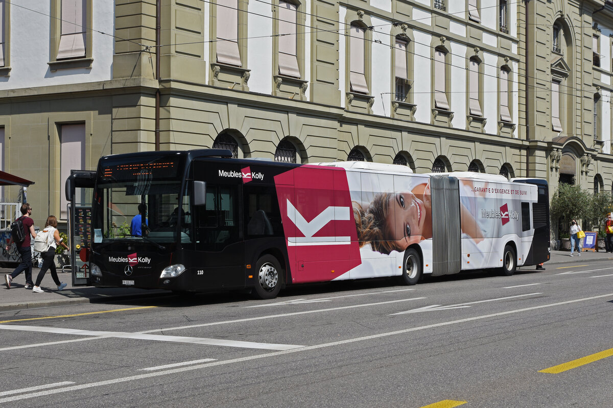 Mercedes Citaro 110 der Transports Publics fribourgeois, im Einsatz als Bahnersatz wartet am 21.08.2021 an der Haltestelle beim Bahnhof Bern.