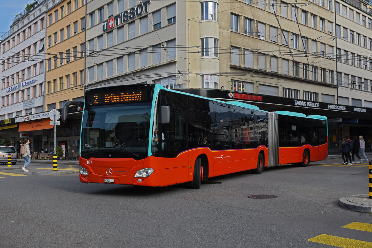 Mercedes Citaro 167, auf der Linie 2, fährt zur Haltestelle beim Bahnhof Biel. Die Aufnahme stammt vom 25.09.2021.