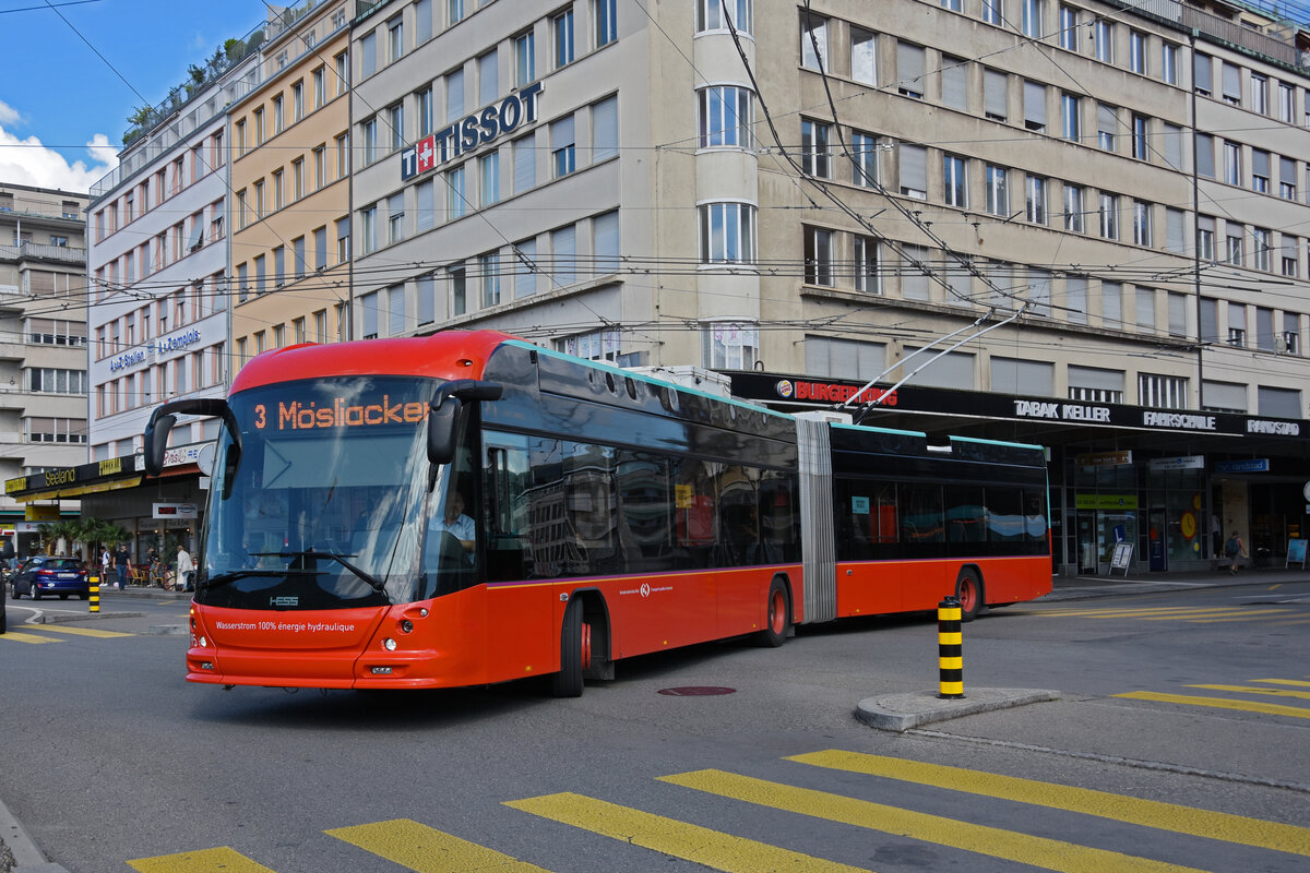Hess Trolleybus 95, auf der Linie 3 fährt am 09.09.2022 bei der Haltestelle am Bahnhof Biel ein.