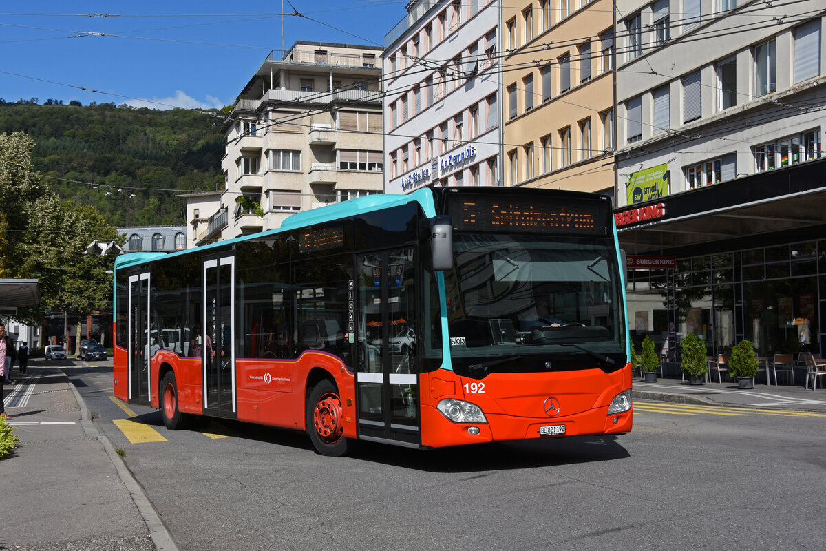 Mercedes Citaro 192, auf der Linie 5, verlässt am 09.09.2022 die Haltestelle beim Bahnhof Biel.