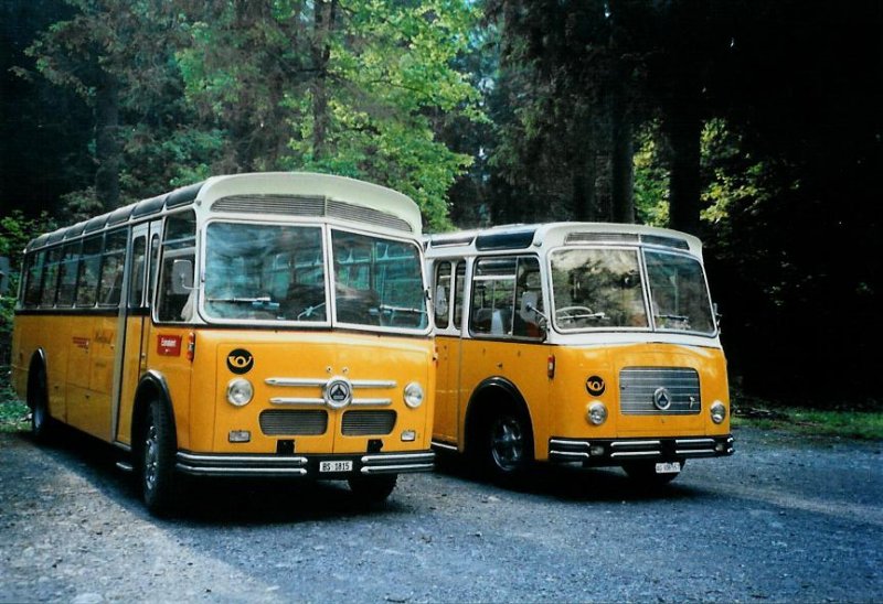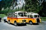 Stebler, Basel BS 1815 Saurer/FHS (ex P 24'143) + Streiff, Gelterkinden AG 306'557 Saurer/Gangloff (ex Krebs, Belpberg) am 27. September 2008 Kiental, Tschingel (Postautofahrt Griesalp-Tschingel)
