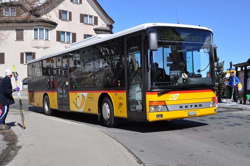 Postauto Graubünden GR 160'387 Setra am 14. März 2010 anlässlich eines Bahnersatz-Einsatzes beim Bahnhof Samedan.