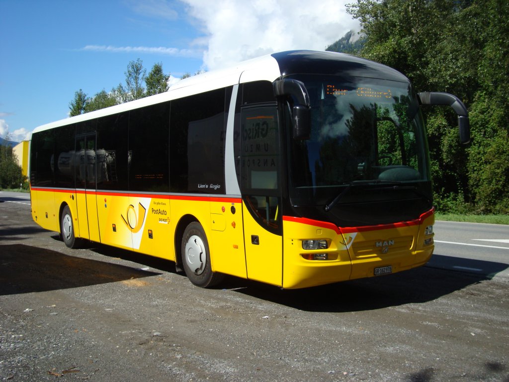 Postauto Iveco Crossway 10.8m in Andeer, Fravi Bogen. Linie 541 nach Thusis. (GR 163 713)