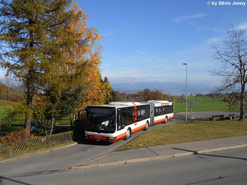Zimmerbergbus/Bamert SZ 40170 (MAN Lion's City G A23) am 5.11.2010 beim Bhf. Samstagern, wo seit der Verlängerung der Linie 170 zum Bahnhof diese Wendeschlaufe mit grandioser Aussicht gebaut wurde.