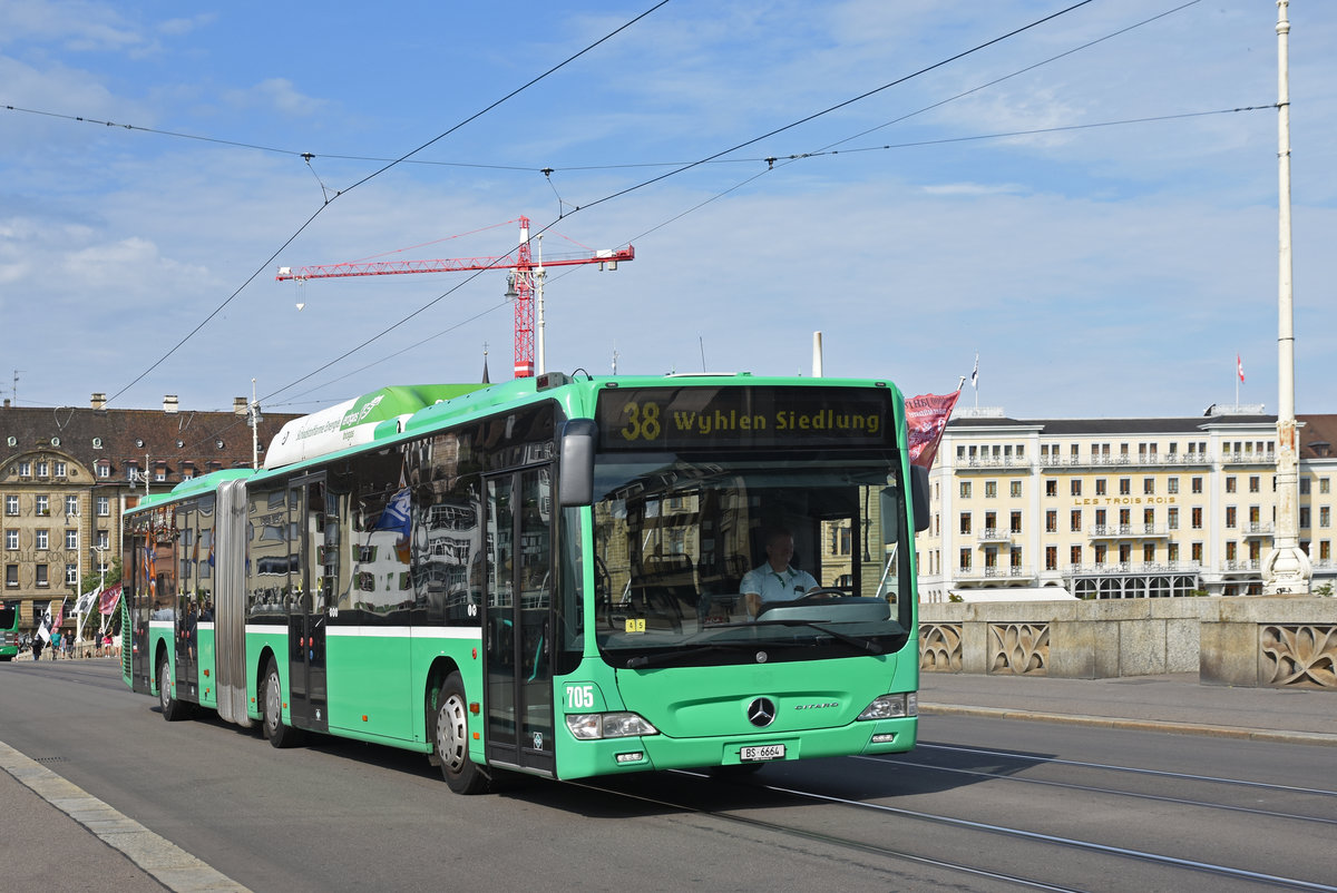 Mercedes Citaro 705, auf der Linie 38, überquert die Mittlere Rheinbrücke. Die Aufnahme stammt vom 27.07.2019.