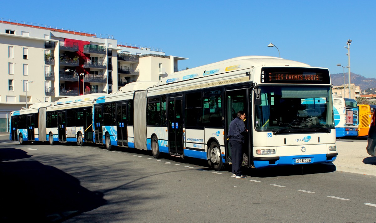 Nice / Nizza Lignes d'Azur Buslinie 6 (Gelenkbus 405) Bushaltestelle Vauban / Boulevard Francois Mitterand am 12. Februar 2015.