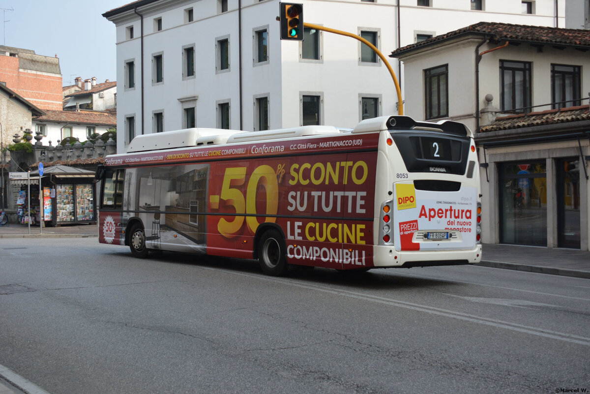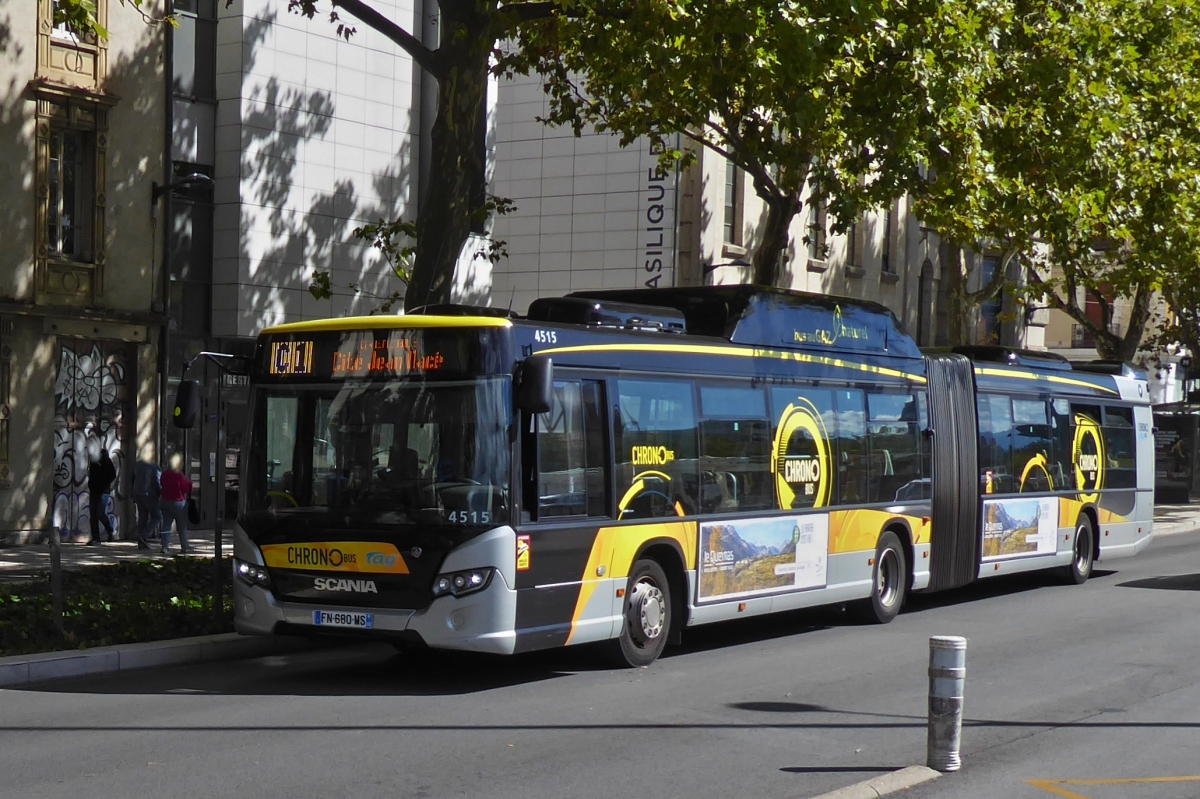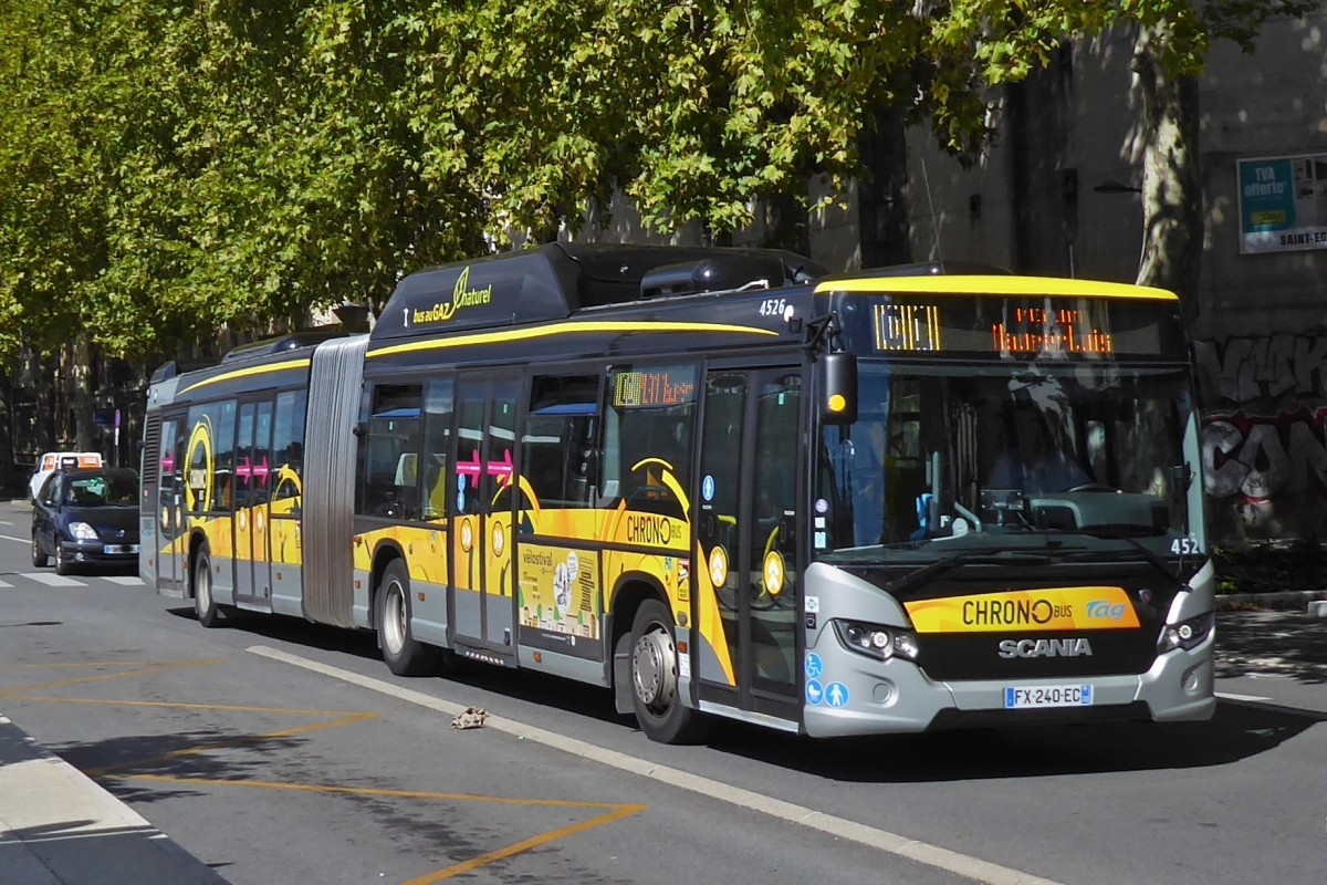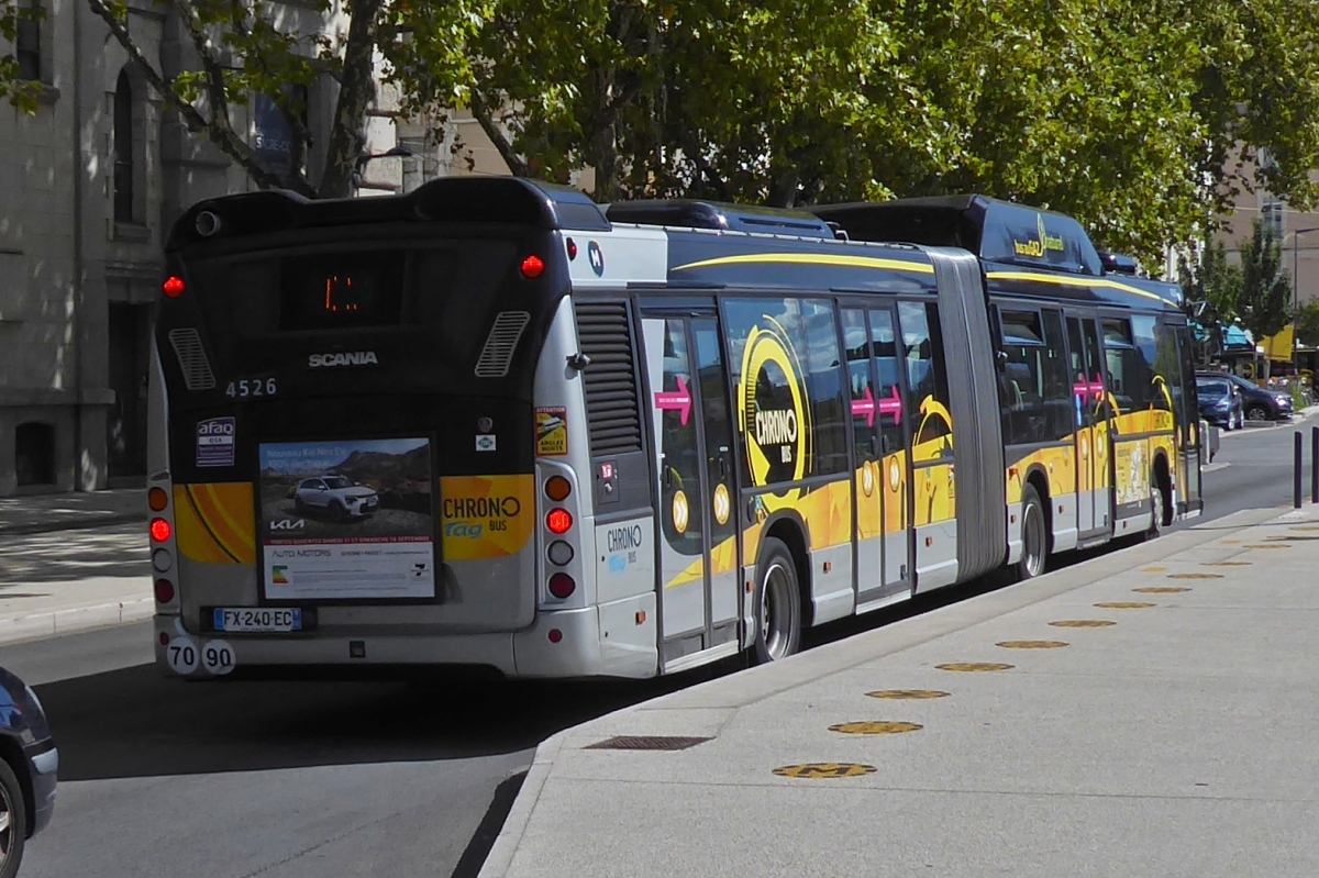 Heckansicht eines Scania Citywide LE HSL mit Naturgasantrieb, im Stadtverkehr von Grenoble im Einsatz. 17.09.2022