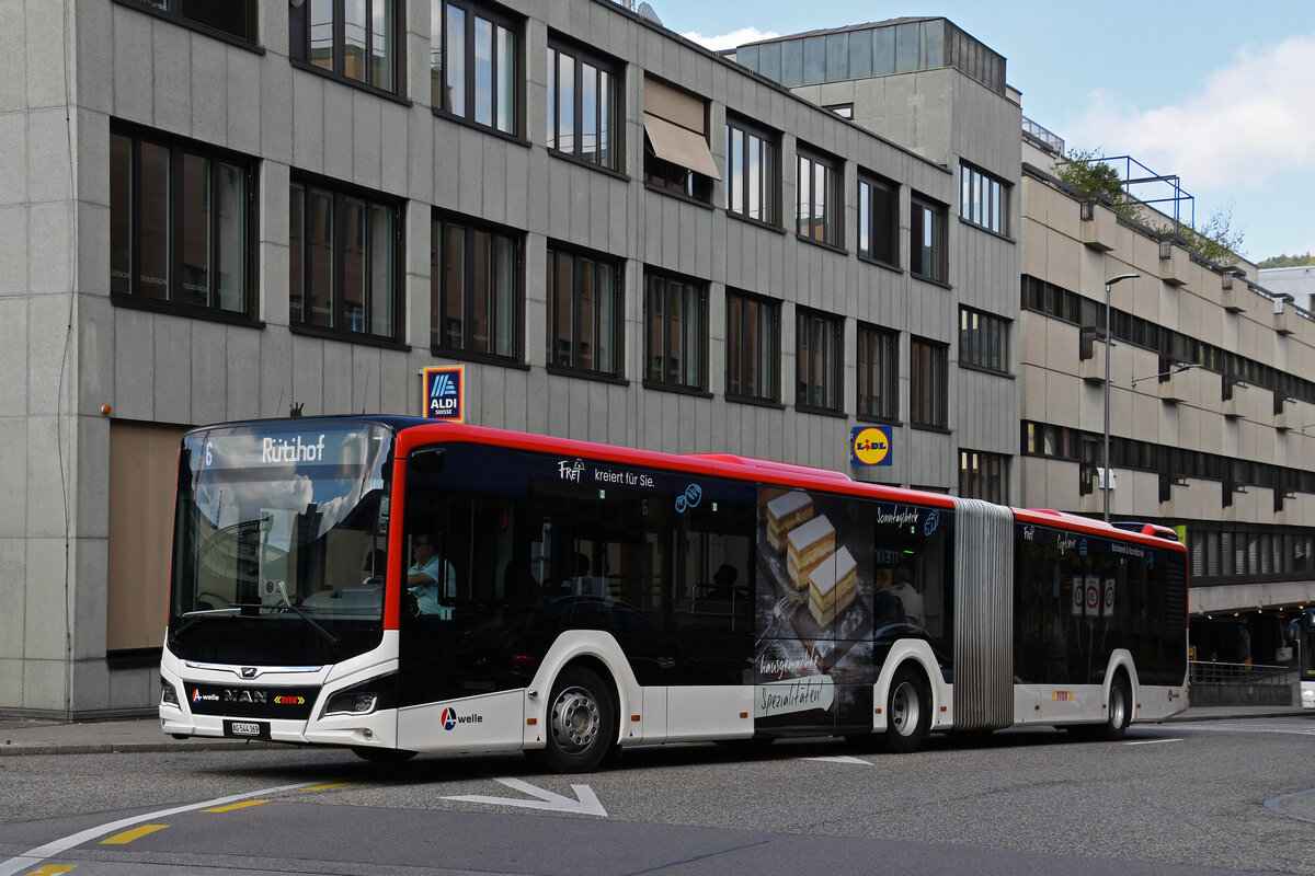 MAN Lions City Hybridbus 131, auf der Linie 6, fährt am 29.09.2025 zur Haltestelle beim Bahnhof Baden.