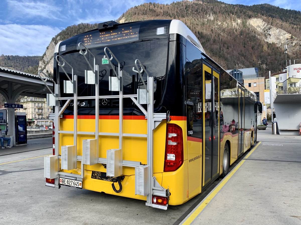 Heckansicht des neuen MB C2 hybrid '11426' "BE 827 645" von PostAuto Interlaken am 23.11.20 beim Bahnhof Interlaken West.