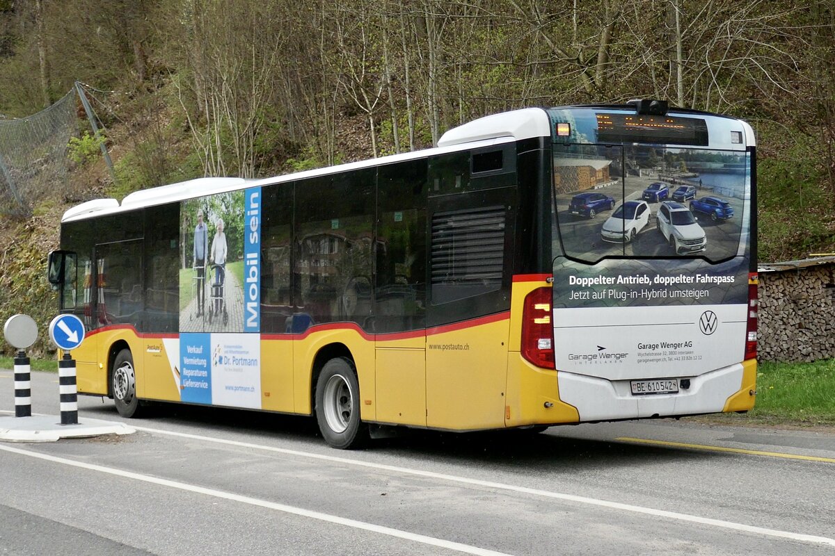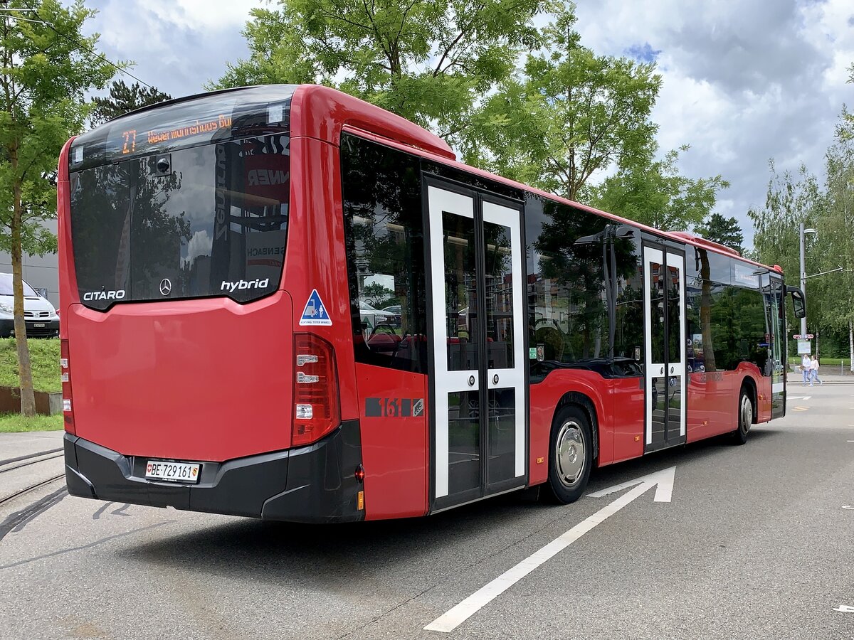 Heckansicht des MB C2 hybrid 161 von Bernmobil am 6.8.21 bei Bethlehem Holenacker.