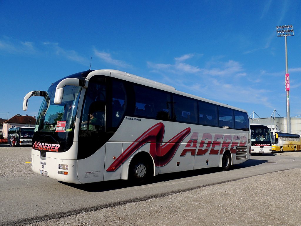 MAN Lions-Coach von Naderer-Reisen startet mit einer Gruppe SVR-Fußballfan´s vor der Keine-Sorgen-Arena in Ried mit Ziel Wien; 120520
