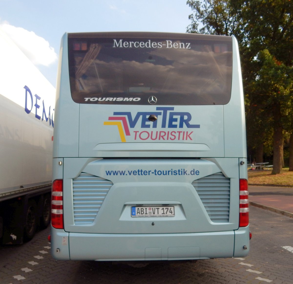 Reisebus Mercedes Benz Tourismo der VETTER Touristik aus Salzfurtkapelle am 10.09.16 auf einer Raststätte an der A2.