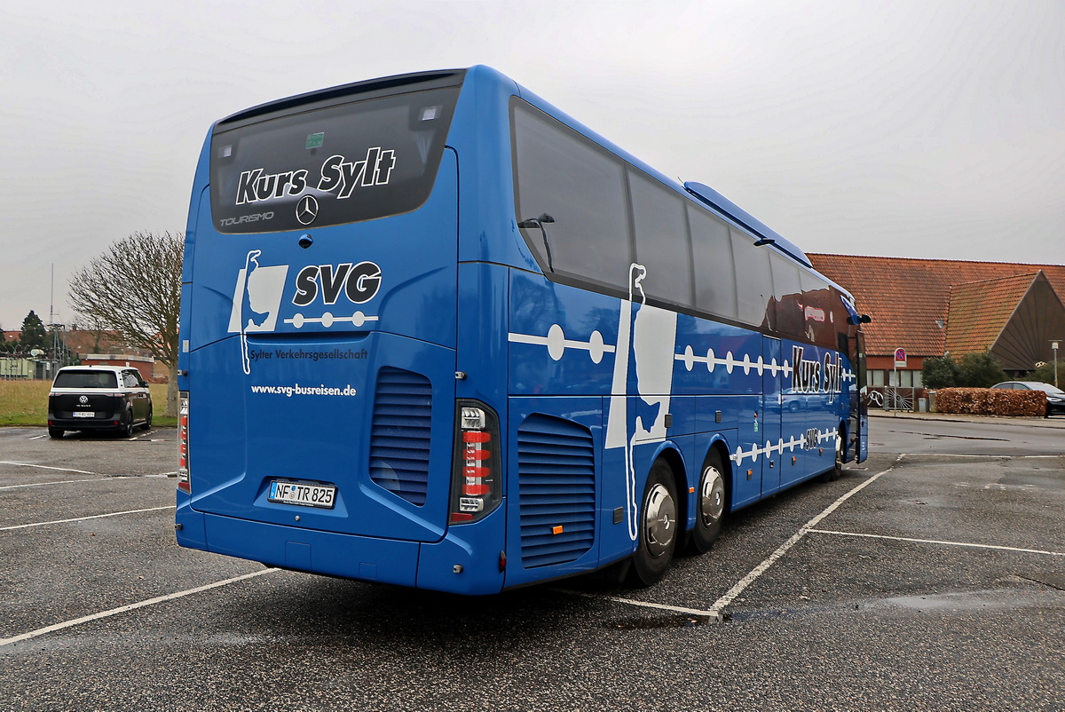 Hier ein weitere Heckansicht eines Mercedes-Benz der Sylter Verkehrsgesellschaft SVG von Sylt kommend in Ribe (Dänemark) am 24. März 2026.