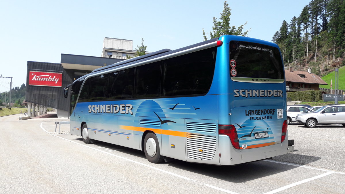 Setra 415 HD bei der Biskuitfabrik Kambly in Trubschachen, Schweiz, Schneider Reisen und Transport AG, Langendorf, SO 21615, Aufgenommen am 28. August 2017