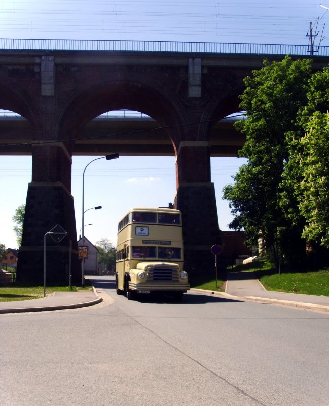 Der Berliner Doppeldecker durchfährt, im Rahmen einer Rundfahrt, den Leubnitzer Viadukt. Werdau am 02.05.2009