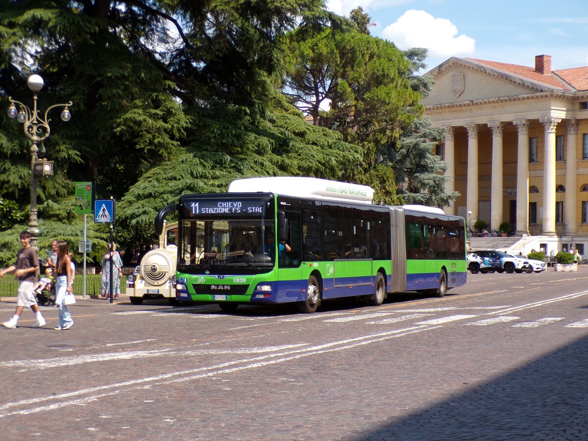 Ein MAN Lions City A23 CNG der ATV (Azienda Transporti Verona) in Verona an der Haltestelle Piazza Bra am 30.7.2025