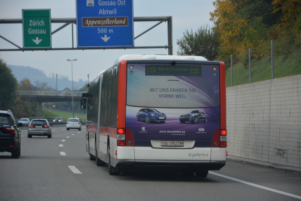 Am 14.10.2015 fährt SG-198278 auf der Linie P+R nach Breitfeld. Aufgenommen wurde ein MAN Lion's City G / Autobahn A1 Sankt Gallen.
