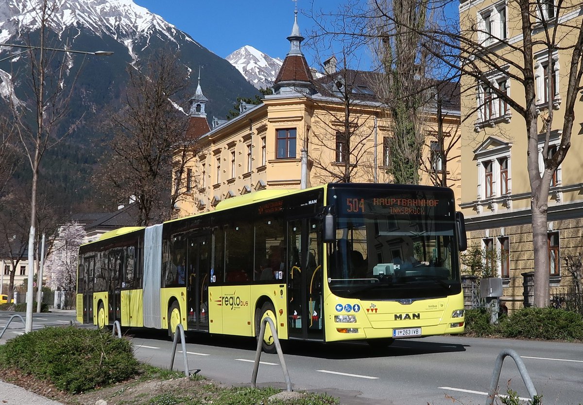 Bus 263 der Innbus Regionalverkehr GmbH, einer Tochtergesellschaft der Innsbrucker Verkehrsbetriebe, fährt als Linie 504 zwischen den Haltestellen Kochstraße und Polizeidirektion.