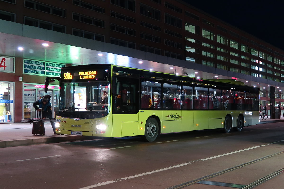 MAN Lion's City der innbus, einer Tochtergesellschaft der Innsbrucker Verkehrsbetriebe, wartet als Linie 590a am Hauptbahnhof auf Abfahrt. Aufgeonmmen 26.2.2017.