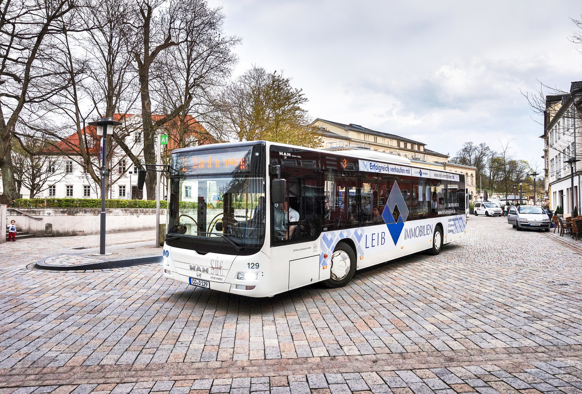 Ein MAN Lion´s City (Nr. 129) der SÜC, fährt am 10.4.2017 aus der Haltestelle Theaterplatz.