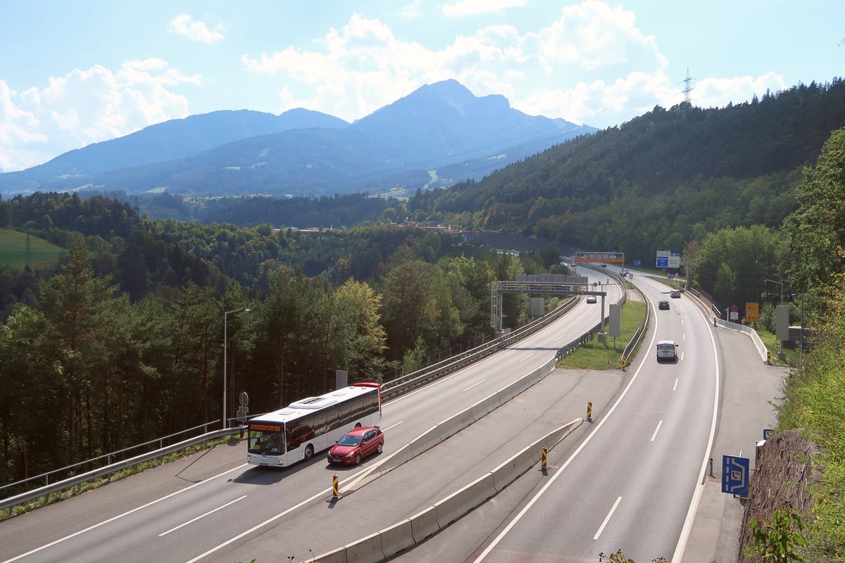 MAN Niederflurbus 3. Generation (Lion's City) von Postbus BD-15102 als Schienenersatzverkehr für die Brennerbahn auf der Brennerautobahn nähe des Bergisels. Aufgenommen 20.8.2018.
