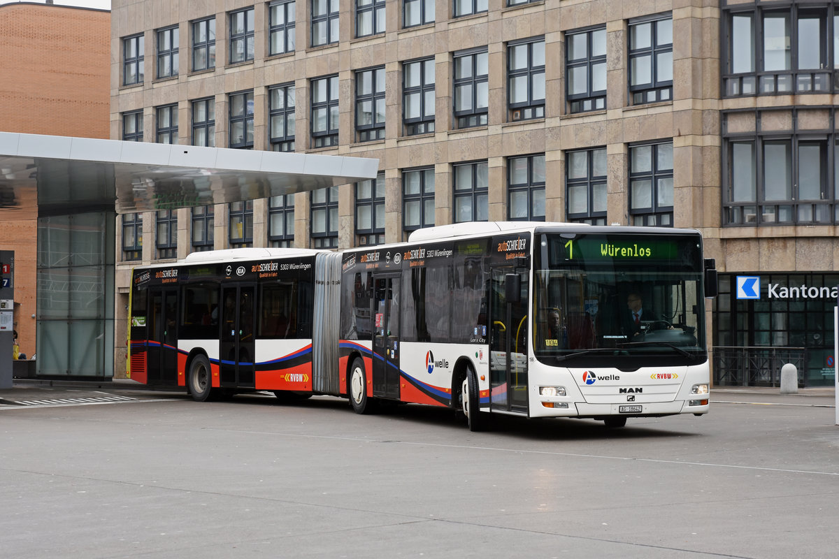 MAN Lions City 156 der RVBW, auf der Linie 1, verlässt die Haltestelle beim Bahnhof Baden.
