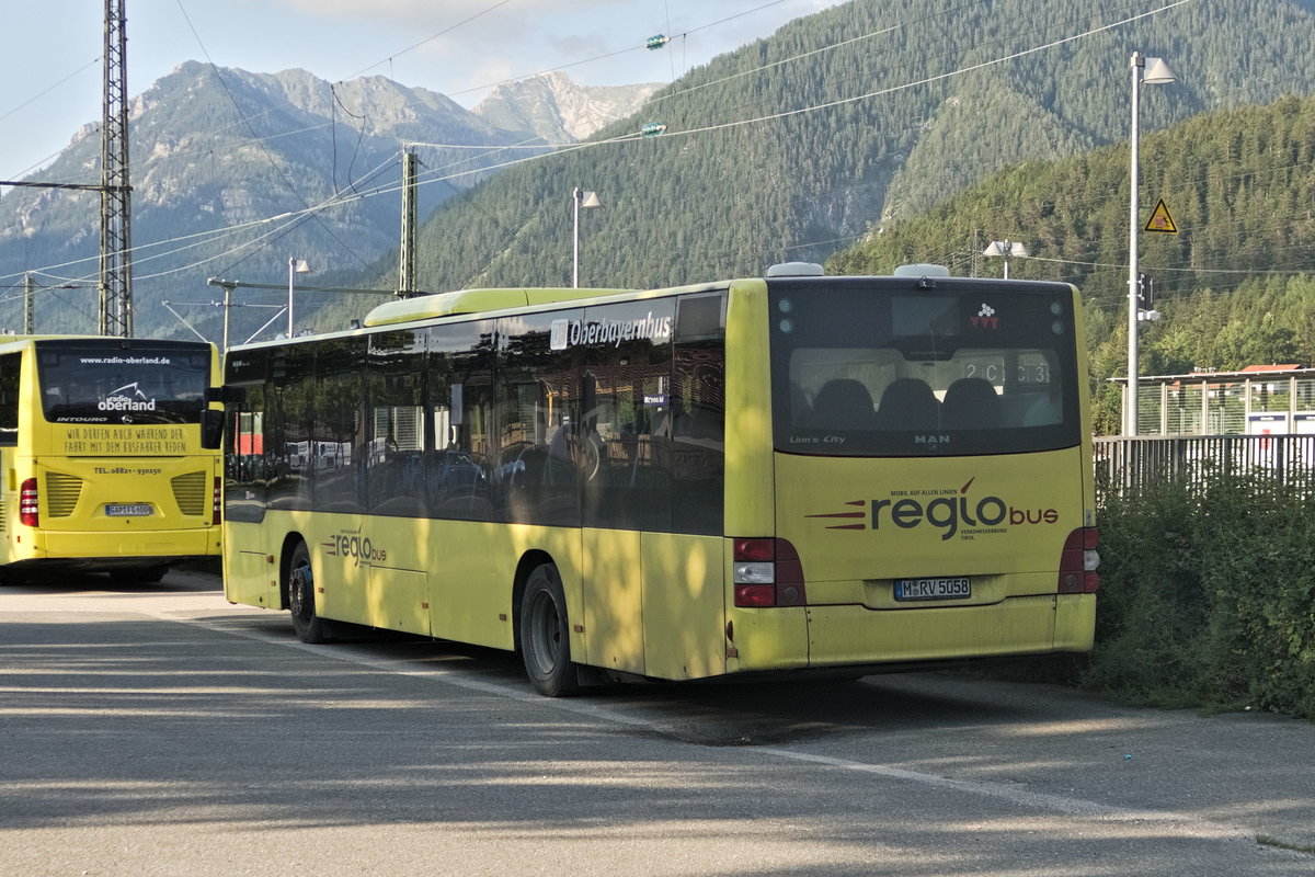 MAN Lion's City von DB Oberbayernbus (M-RV 5058) in der Lackierung und Beklebung Regiobus des Verkehrsverbundes Tirol, abgestellt am Bahnhof Mittenwald.