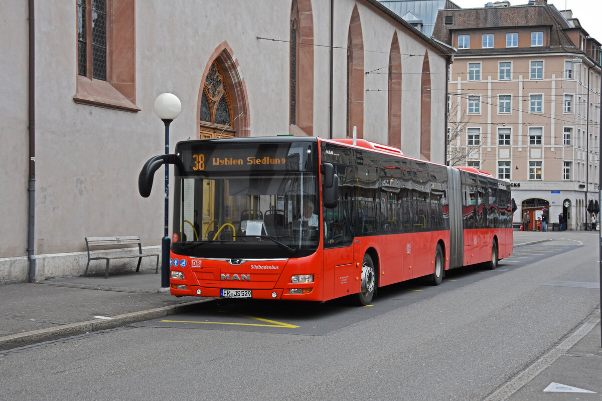 MAN Lions City von Südbadenbus, auf der Linie 38, wartet an der Haltestelle Claraplatz. Die Aufnahme stammt vom 06.02.2022.