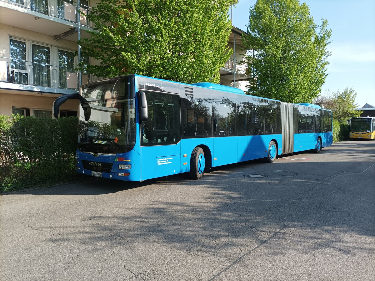 Die Frontansicht Luschin MAN Lions City Gelenkbusses am 21.04.2022 in Lörrach Karl Herbster Platz